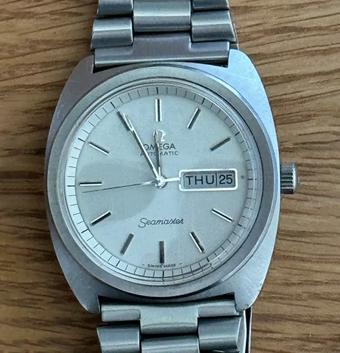 Brand Omega Model Seamaster Day/Date Reference 166.064 Watch # n/a Movement Automatic Calibre 752 Year 1975 Material Steel Diameter 41mm Water Resistant No Colour Silver Glass Hesalite Dial Colour